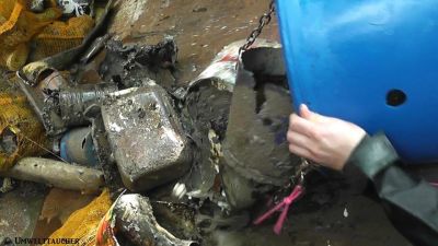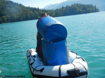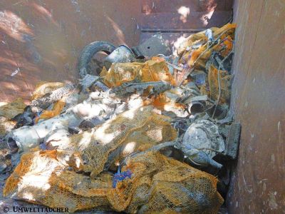 Aber nun zum eigentlichen Einsatz. Am Samstag um 09:00 ging es vor Ort los mit Ausrüstung ausräumen, Equipment vorbereiten und einem anschließendem Briefing. Anschließend wurden Gruppen eingeteilt und es wurde los getaucht. Es wurden drei große blaue Sammelfässer versenkt, die unter Wasser als Müllcontainer dienen. Von dort aus wurde in verschiedene Richtungen getaucht und der Müll in kleine Netze gesteckt. Wenn das Netz voll war, hat man dieses in die blaue Tonne gepackt und man ging mit einem neuen auf die Pirsch. War die Tonne voll, wurde diese mit einem Hebesack an die Oberfläche gebracht und an Land in einem bereit gestellten Container verfrachtet. Die Arbeiten dauerten bis Sonntag in den Nachmittag hinein an.