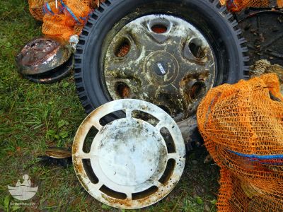 Wir konnten wieder eine Vielfältigkeit an Müll bergen. Darunter eine Menge Glasflaschen – leider auch wieder viele zerbrochene, Plastikbecher, Sackerl und andere Plastikteile, Dosen in unterschiedlichen Größen, Radkappen, Kübel, diverses Grillzubehör, Badeschlapfen, Schuhe, Zigarettenstummel, eine Fahrradkette, Kronkorken, Mistgabeln, ein Paddel, Metallteile, ein paar undefinierbare Gegenstände und last but not least: unser Traditionsautoreifen, der fast bei jedem Clean Up gefunden wird.