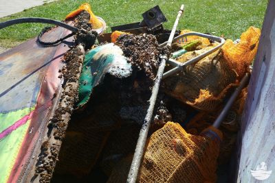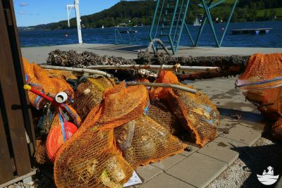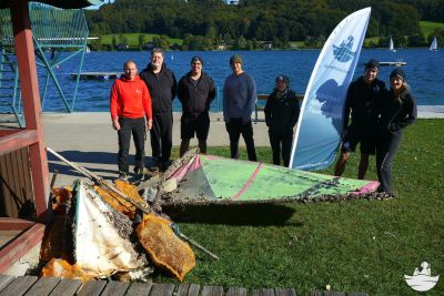 Dann ging es gleich wieder weiter - jetzt jedoch mit stärkeren Wind, der die Seeoberfläche mit Wellen aufrauhte und die Sichtweiten unter Wasser eintrübten. Dennoch brachte Runde zwei dann Gegenstände zum Vorschein, die nicht mehr in die Sammelnetze passten. Ein großes Eisenteil, welches wir nicht zuordnen konnten aber auch schon im letzten Jahr gefunden haben, musste mittels eines Hebesacks geborgen werden. Teile eines großen Sonnenschirmes, ein komplettes Windsurf-Segel inkl. Baum, ein nostalgisches Piz Buin-Werbeschild und noch mehr.
