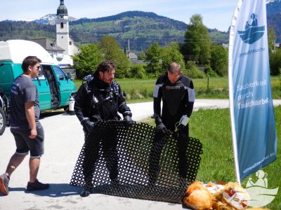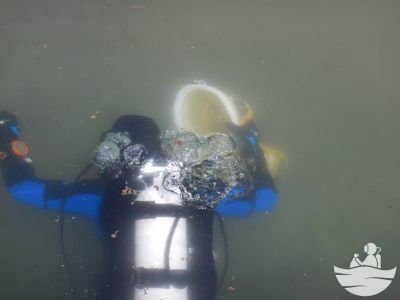 Die Sicht lies leider etwas zu wünschen übrig, was wir durch eine größere Teamstärke und angenehmen Wassertemperaturen um die 11 Grad herum ausgleichen konnten. Plastikbecher-, Folien-, Verpackungen, Angelzubehör diversester Arten, Kronkorken, eine Tauchermaske, eine Sonnenbrille, alte Schilder vom ehemaligen Sprungturm, Papiermüll, Alufolien, Glasflaschen und ein Bierkrug wurden vom schlammigen Untergrund entfernt.