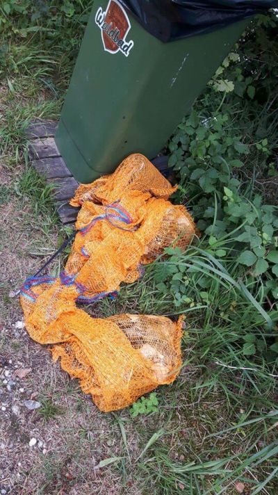 Glasflaschen und Gläser, Kunststoffflaschen, Plastikbecher, Plastiksäcken, Zeitungen, Flaschenetiketten, Alufolien, Kronkorken, Kunststoffbesteck, Plastikfolien, mit Steine gefüllte Plastiksäcke, Dosen und Dosenverschlüsse, Schnüre