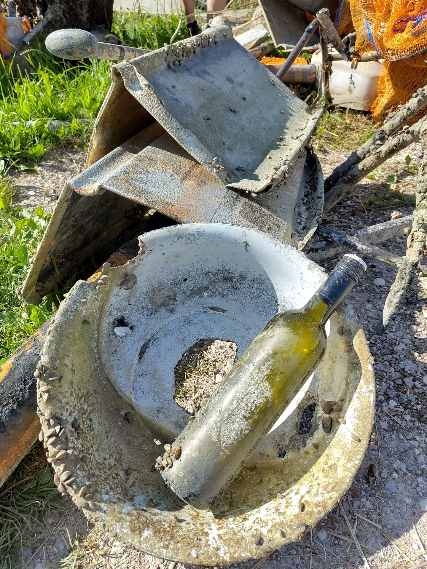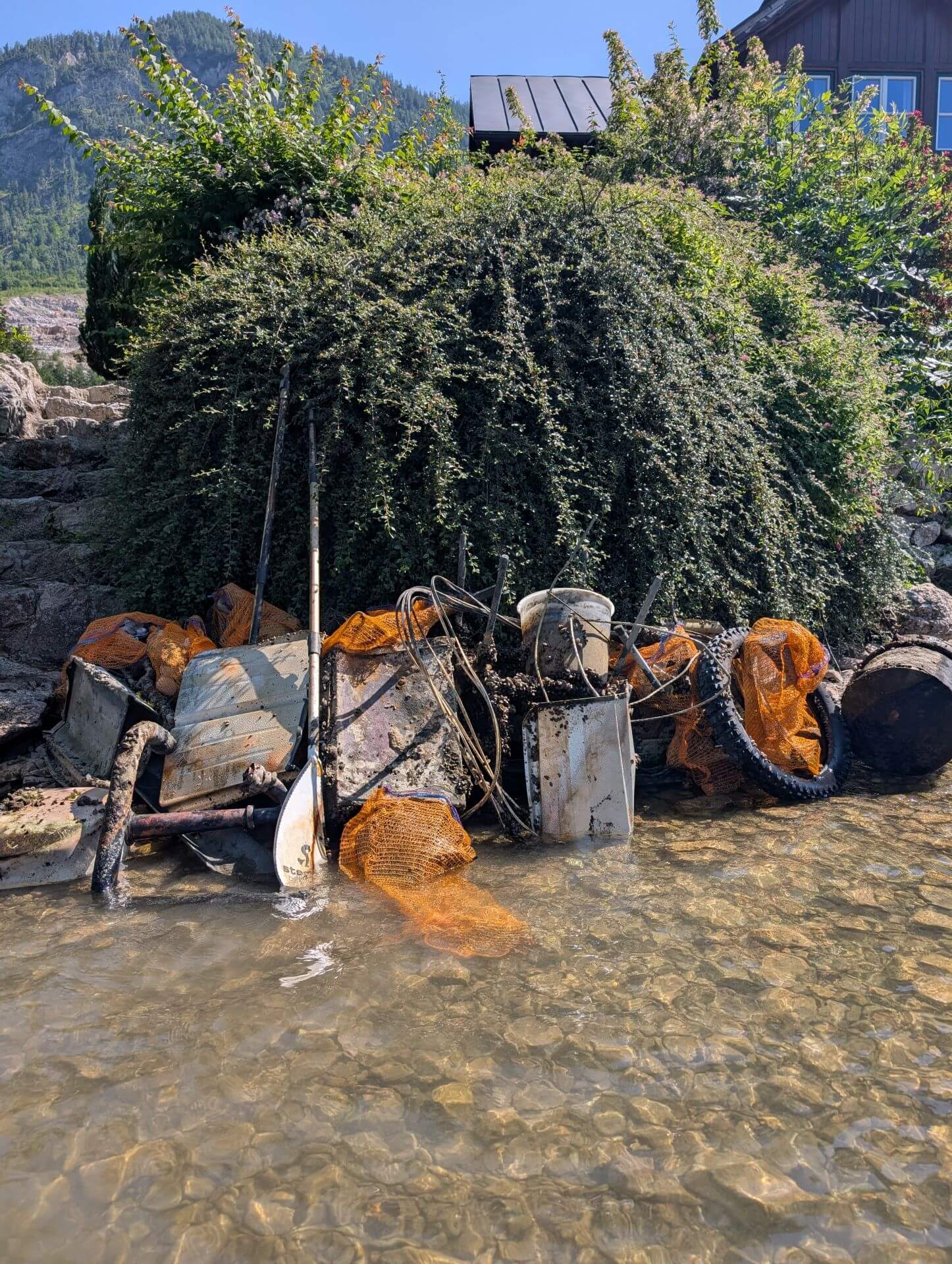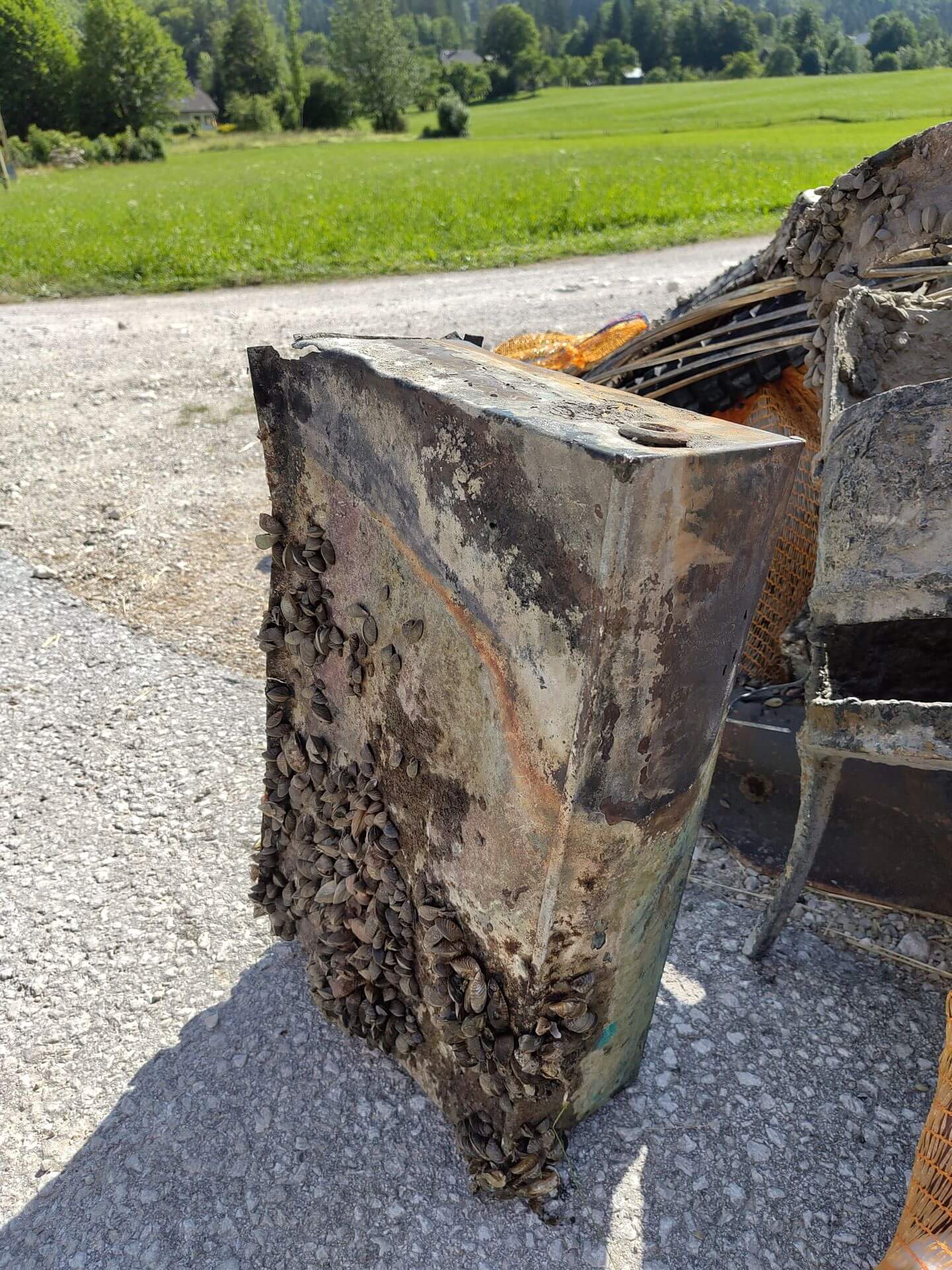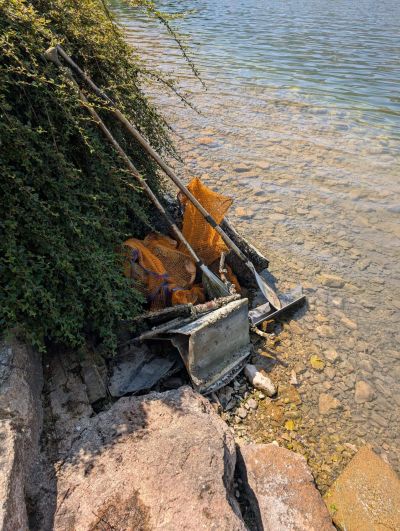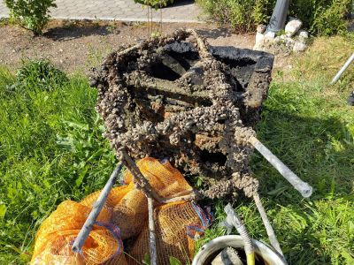 Wir fanden dort gleich mal verschiedene Gegenstände – Töpfe, Altmetall, Flaschen, Teile eines Dachs, Dachpappe, Teile eines Fahrrads, eine Gummimatte. Es wurden an diesem Tag außerdem 2 Öfen, Teile einer Toilette, ein Ölmesser, alte Schubladen und andere Dinge gefunden. Diese Dinge stammen zum Teil aus einer Zeit, in der es noch keine Recyclinghöfe gab, zum Teil werden sie aber auch verloren oder vom Sturm in den See geweht. So freute sich beispielsweise die Hausbesitzerin sehr über die Rückgabe eines Metallblumentopfes, der während eines Sturms im See verschwunden war.