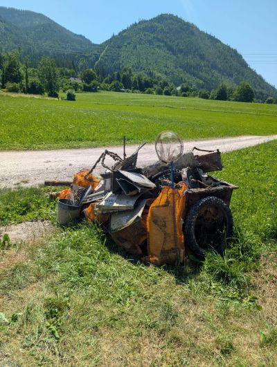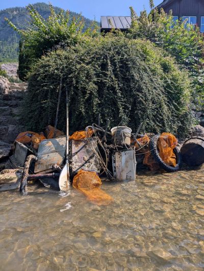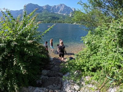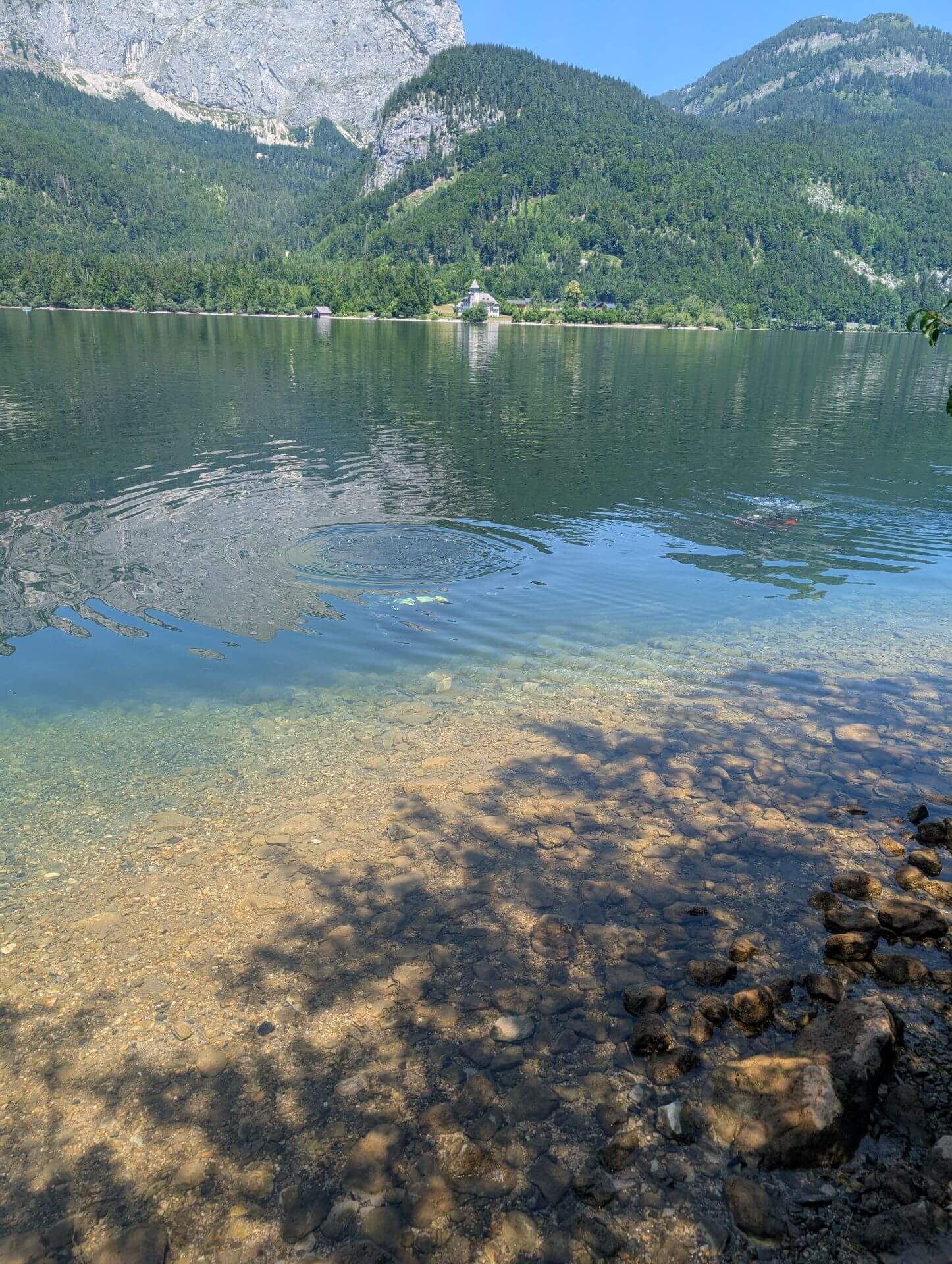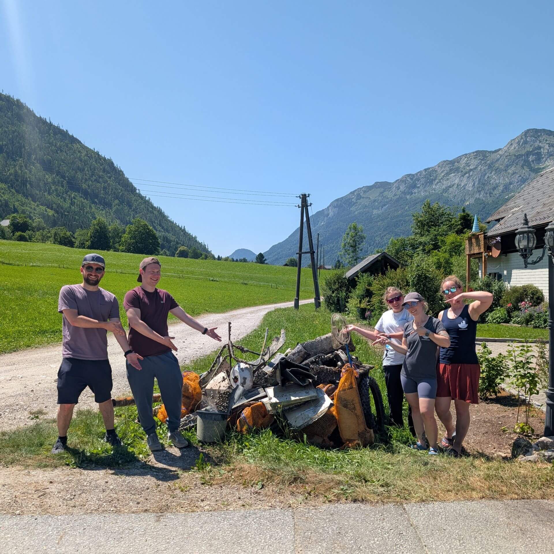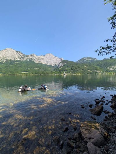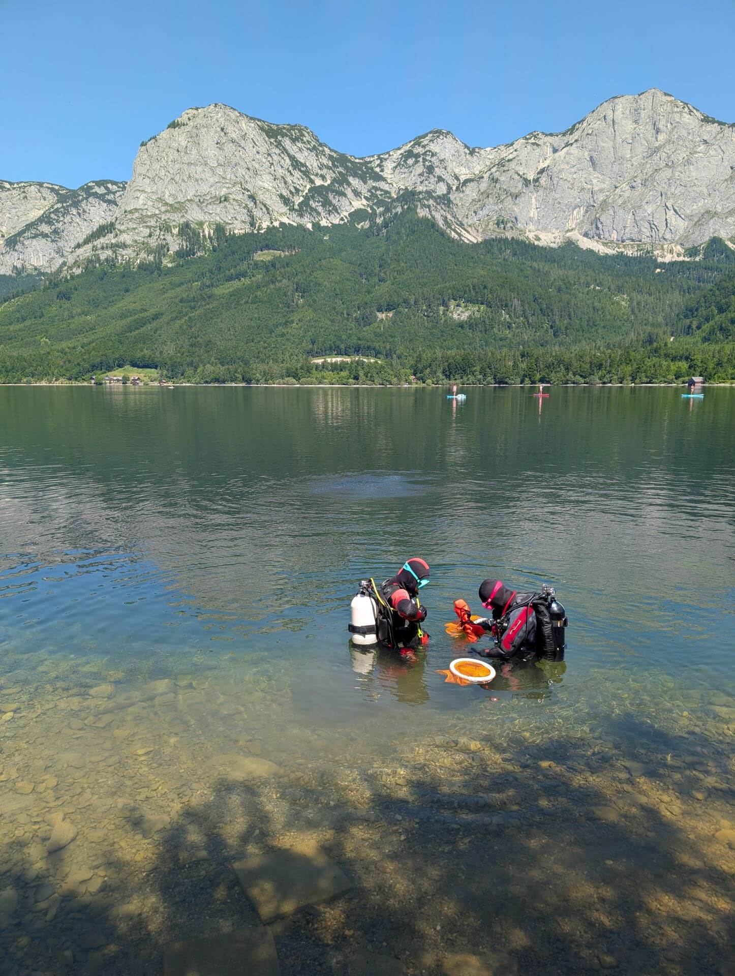 Am 21. Juni 2025 machten wir uns mal wieder auf den Weg Grundlsee, um dort an neuen Plätzen eine Reinigung durchzuführen. Wir hatten im Vorfeld bereits Kontakt zu sehr netten Anrainer:innen aufgenommen, die sich schon sehr darauf freuten, dass wir eventuelle Altlasten an ihrem Grundstück beseitigen wollten. Als wir dort ankamen, wurden wir sehr nett begrüßt. Wir durften uns dann neben dem Haus mit unserer Ausrüstung auf einer Wiese ausbreiten. Dort gab es einen tollen direkten Seezugang über eine kleine Treppe mit einem natürlichen Kies- und Steinstrand – perfekt für uns!