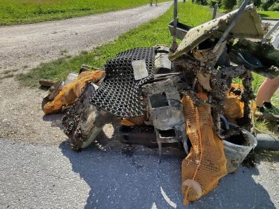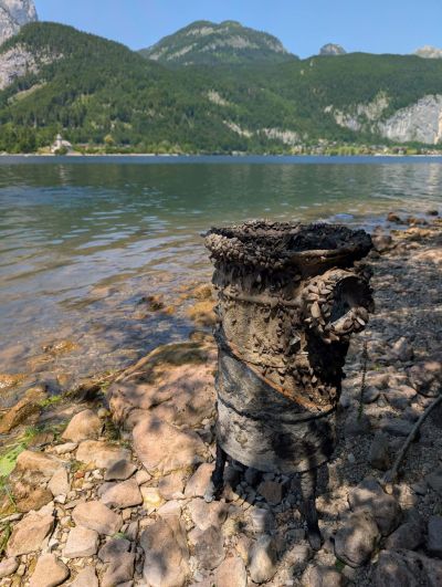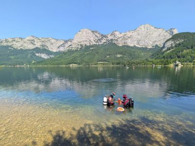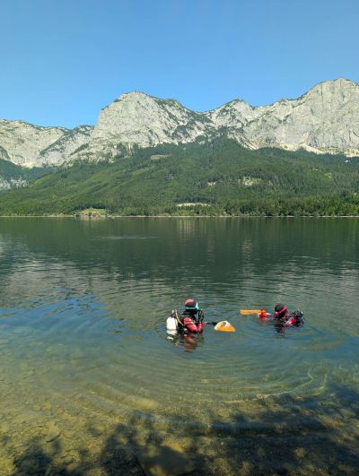 Beim zweiten Tauchgang tauchte ein Team nach rechts ab, um sich dort umzusehen. Dort fanden wir zwei alte Plattformen (eine tiefer auf ~8-10 m, eine weiter oben auf ~5 m). An der Plattform vorbei lag eine Metalldose, die wir einsammelten. Es stellte sich schnell heraus, dass diese jedoch nicht mehr dicht war und aus ihr eine schwarze zähe Flüssigkeit herauskam, eventuell Bitumen. Unterwasser schmierten wir diese versehentlich an unsere Atemgeräte, ein Taucher bekam sie auch in den Mund – keine angenehme Erfahrung. Zurück am Ufer ärgerten wir uns über die Flecken auf der Ausrüstung – alles privat von uns selbst gekaufte Gegenstände und legten die Dose an Land ab. Schnell stellte sich jedoch heraus, dass sie weiterhin auslief: Es bildeten sich schwarze Flecken, man roch die Flüssigkeit und sie gelangte auch ins Wasser. Da sich eine kleine Menge Öl auf der Seeoberfläche gesammelt hatte, riefen wir mithilfe der Hausbesitzerin kurzerhand die Feuerwehr, um die Verunreinigung zu entfernen, damit der See und die Pflanzen und Tiere nicht in Mitleidenschaft gezogen werden. Die Feuerwehr Gössl rückte auch in kürzester Zeit mit dem Boot an, um sich ein Bild der Lage zu machen. Nachdem sie sich vergewissert hatten, dass es sich nur um eine kleine Menge Öl handelte, fuhren sie zurück, holten die benötigte Ausrüstung und kamen wieder, um es zu beseitigen. Der Feuerwehrkommandant war zudem noch so nett, uns mit der Bergung eines größeren Ofens zu helfen, den wir kurz zuvor gefunden hatten und der – wie wir später feststellten – 50 kg wog. Vielen Dank an dieser Stelle an die FF Gössl, die uns tatkräftig unterstützt hat!