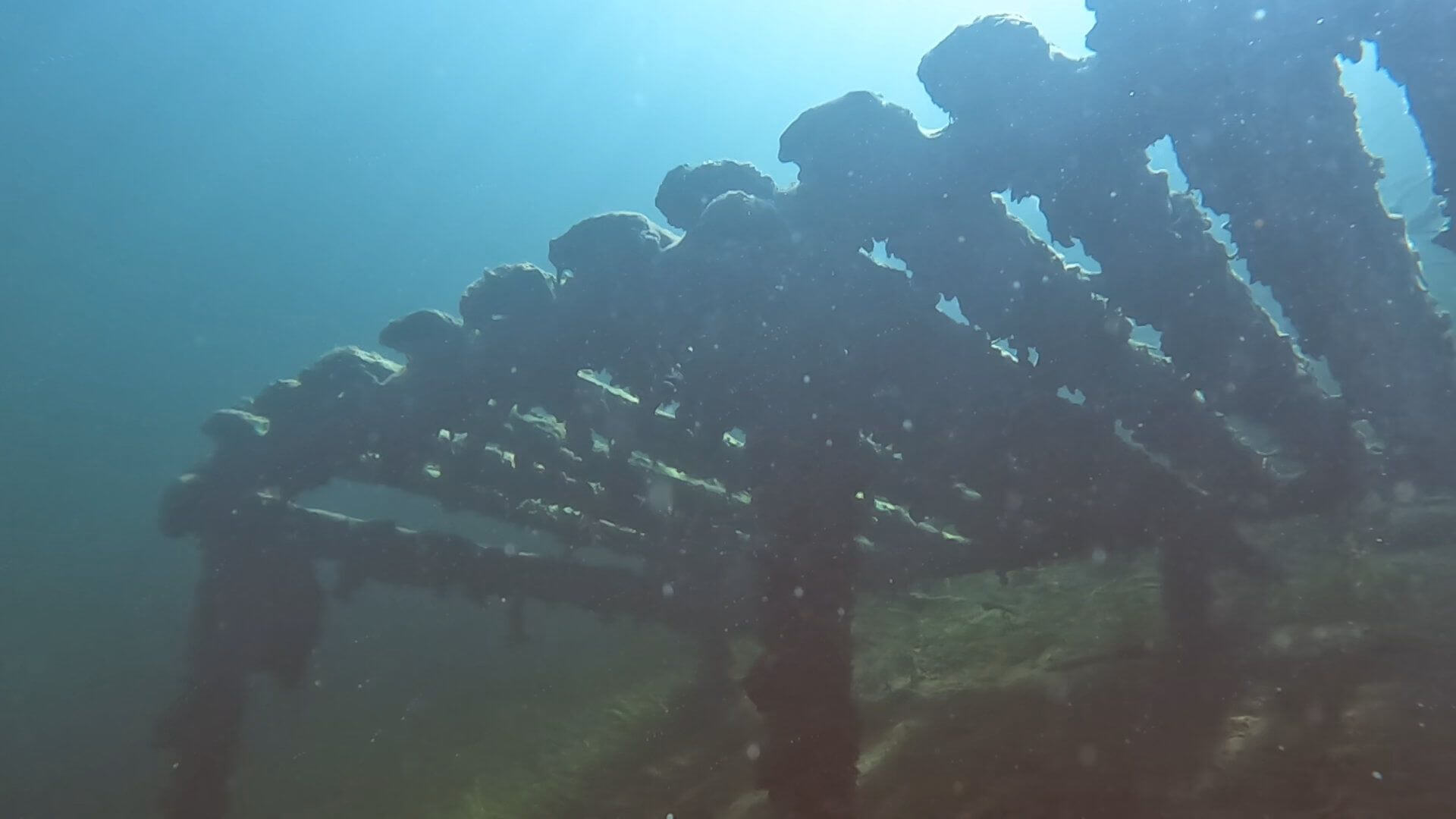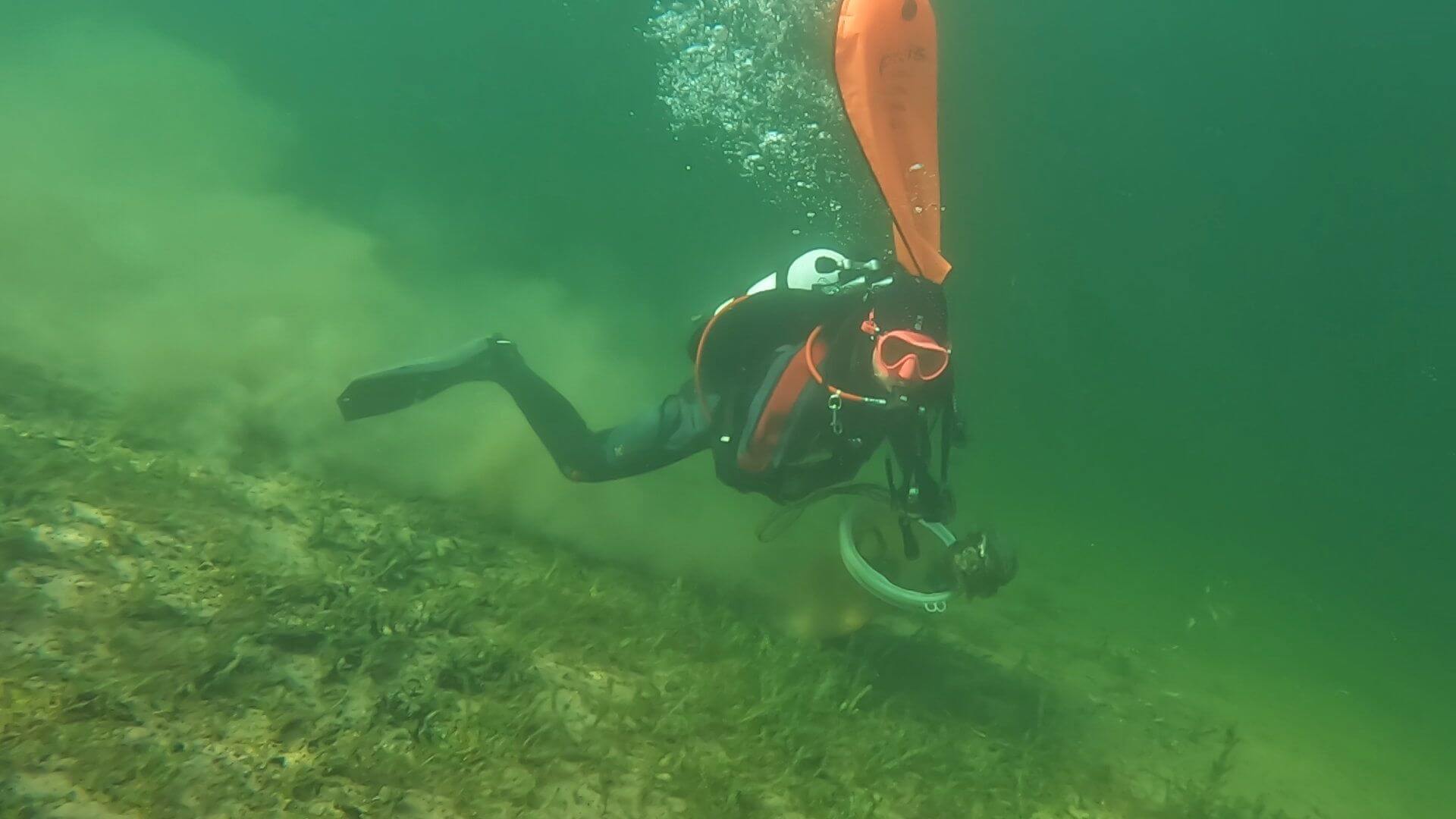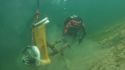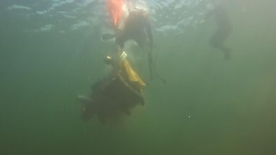 Wir inspizierten also den Einstieg, machten uns einen Plan und dachten, dass wir nicht viel Müll finden würden. Oh wie hatten wir uns doch geirrt! Nach dem Zusammenbau und dem Check der Ausrüstung sowie der Teameinteilung, machten wir uns unter Wasser Linkerhand auf den Weg mit einem Team auf 5 und einem auf 10 m Tiefe. Das Wasser war sehr klar und hatte oben über 20, weiter unten 13 °C. Oben gab es einen schönen Bewuchs mit verschiedenen Pflanzen, die viele Fische als ihr zuhause auserkoren hatten.