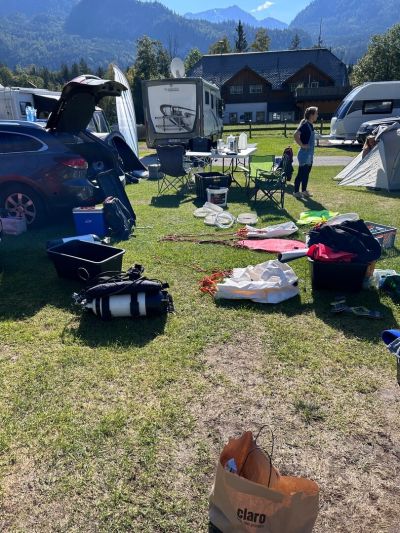 Nun blieb uns nur noch das Equipment wieder zu zerlegen, die Anzüge am Campingplatz zu trocknen, unsere Pressluftflaschen füllen zu lassen und uns dann mit dem anderen Team am Campingplatz zu treffen und uns um die Inhalte unserer Kühlbox zu kümmern.