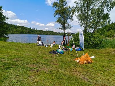 Die Tierwelt enttäuschte nicht. Sofern wir sie unter Wasser sehen konnten begegneten wir einem kleinen Hecht, ein paar Flussbarschen und einem Fischschwarm aus lauter Jungtieren der sich im Schilfgürtel versteckte. Einfacher zu entdecken waren die vielen Teichmuscheln. Als die Tauchgänge beendet waren und gerade auch keine Schwimmer im Wasser waren konnten wir eine Schlange beim Schwimmen beobachten während ein großer Roter Milan über uns kreiste.