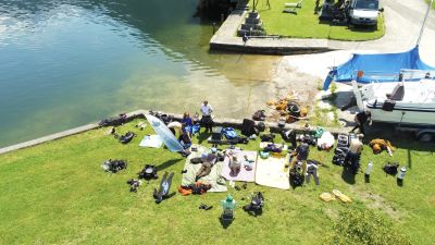 Nachdem wir auf der öffentlichen Wiese unser Basiscamp aufgeschlagen und erstmal viel Platz mit Pressluftflaschen und Tauchausrüstung blockiert hatten begannen alle schon eifrig ihr Equipment aufzubauen und sich in die Tauchanzüge zu zwängen. Groß war die Vorfreude ins kühle Nass zu tauchen und bei guten Sichtweiten unter Wasser nach Müll zu suchen.