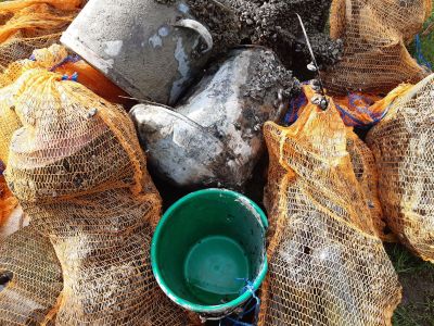 Tauchausrüstung wurde bei leicht verhangenem Sonnenschein und etwas böigen Wind zusammengebaut und die Sammelnetze, Hebesäcke und was wir sonst noch alles benötigten zurechtgelegt. Ein kurzes Briefing noch und schon merkte man anhand der Ausrufe "Huuuuuuuuuuuu", dass nach und nach die Umwelttaucher in die nassen Tauchanzüge hüpften. Die Körperwärme allerdings heizte den Anzug schnell auf und die Wegstrecke die wir zu Fuss mit der kompletten Ausrüstung zurücklegen mussten heizte und noch gut auf, sodass wir uns dann doch schon auf das kühle Nass freuten.