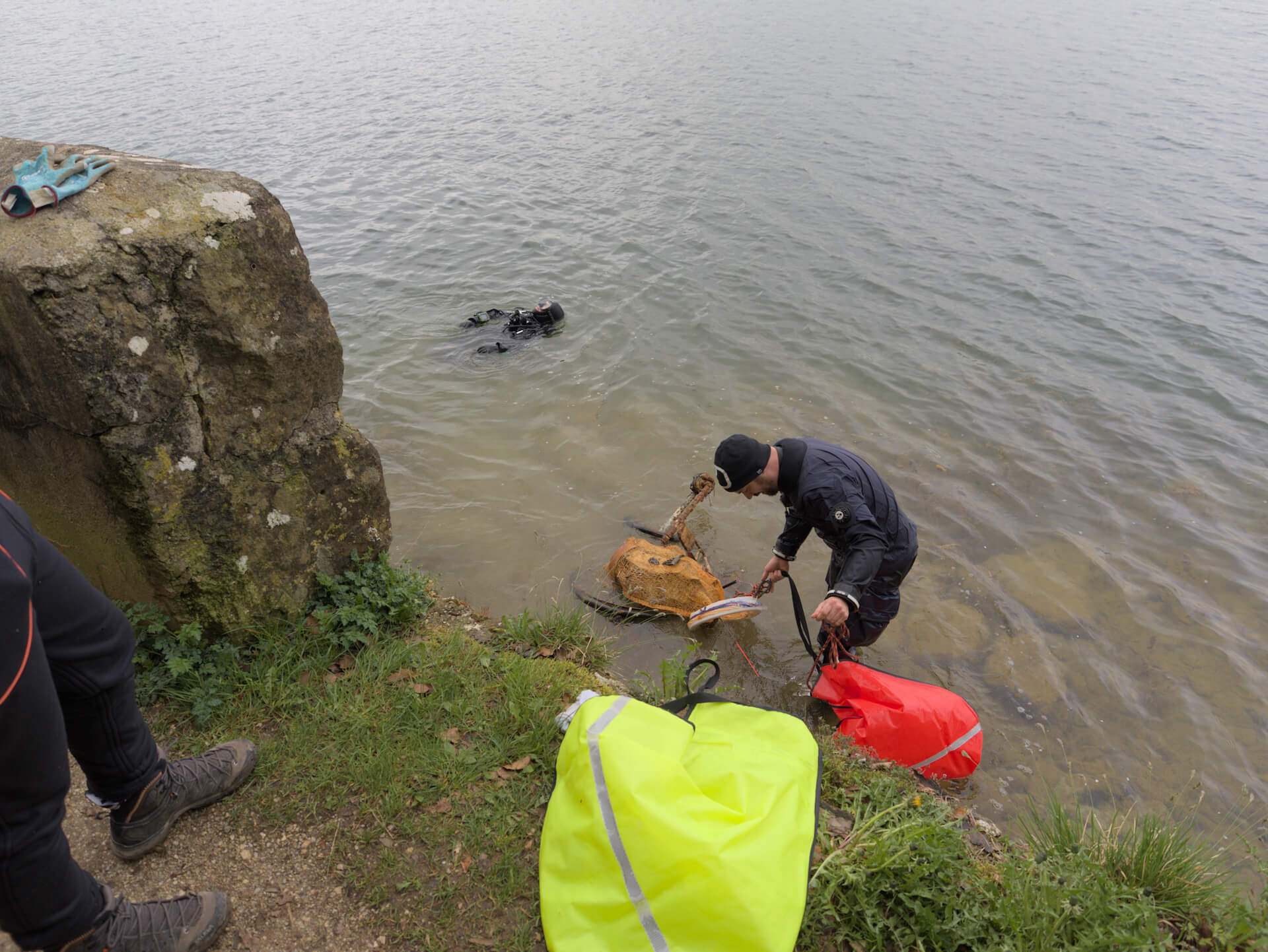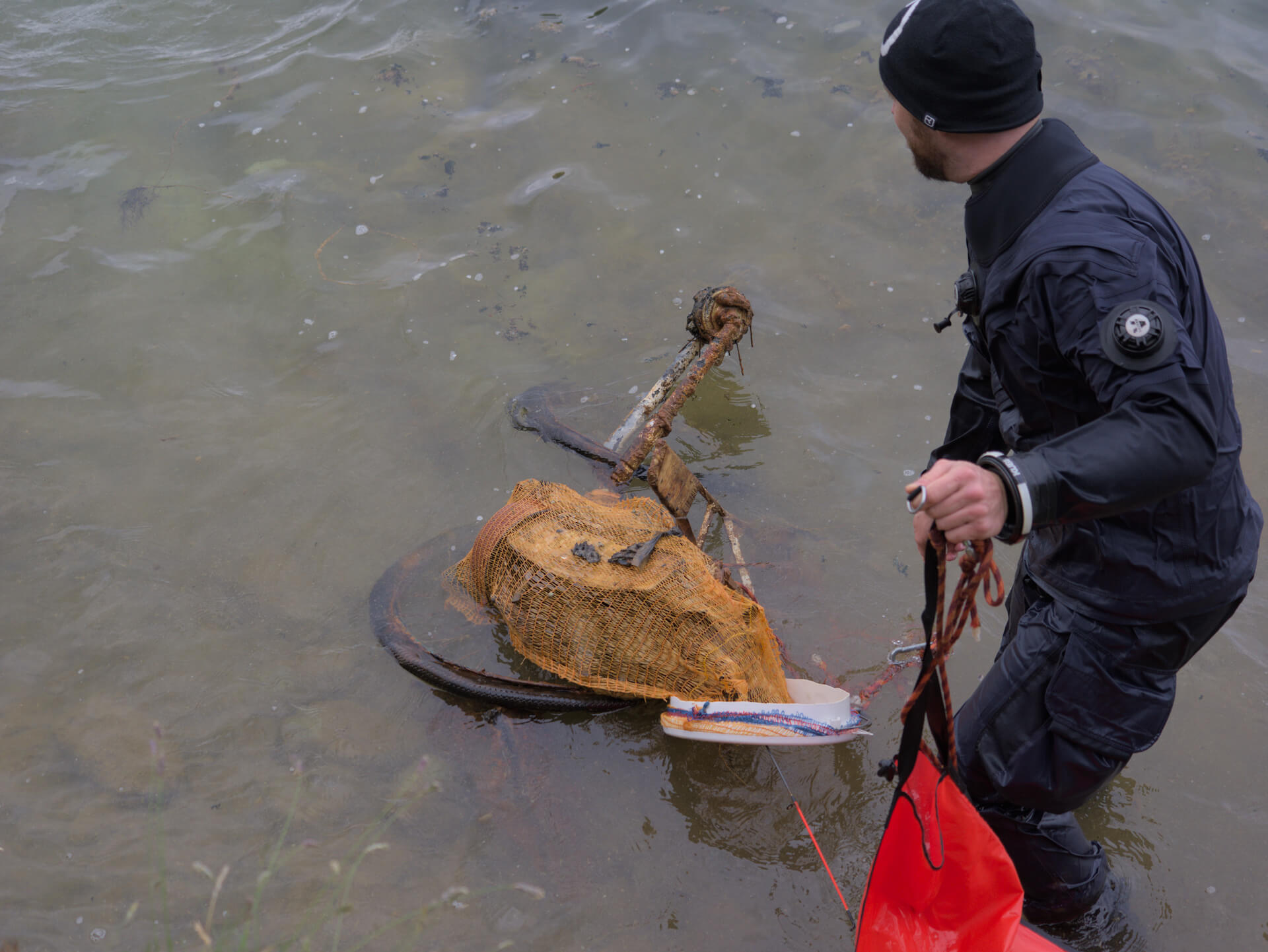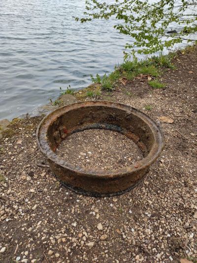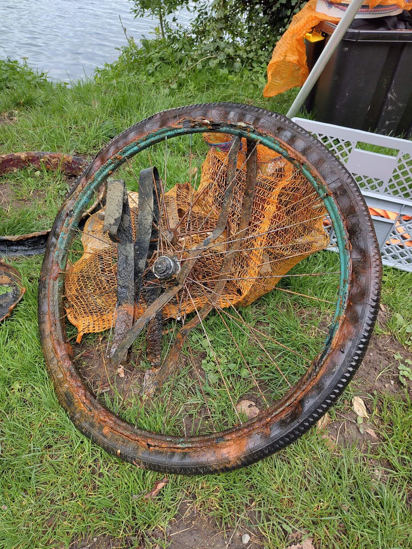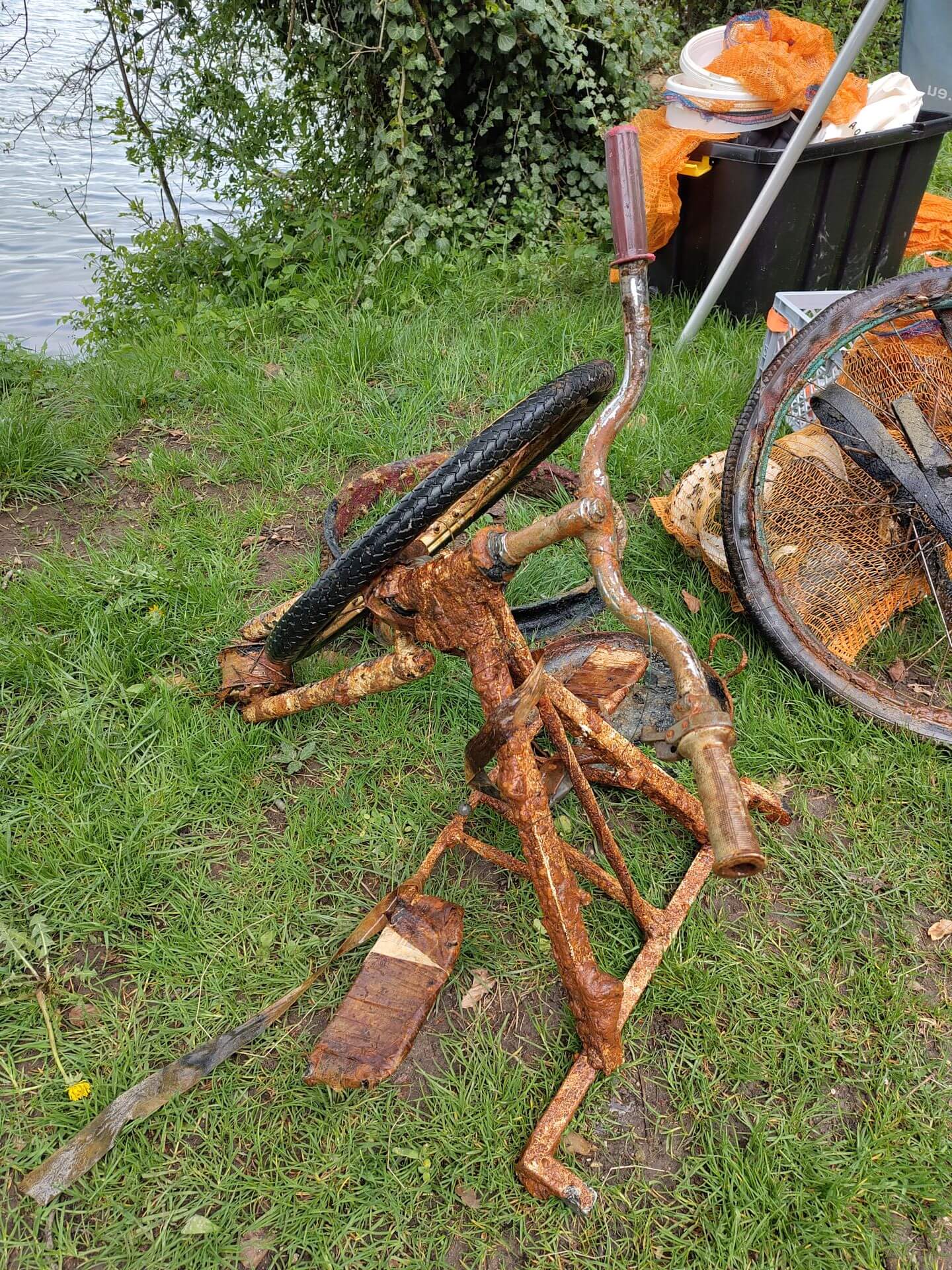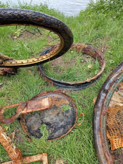 Neben dem üblichen Unrat wie Angelschnüre, stießen wir auf erstaunliche Zeugnisse menschlicher Vergessenheit: verrostete Felgen, das traurige Skelett eines Dreirads inklusive seiner Gummireifen, ausgediente Pfannen und Töpfe, bunte Splitter zerbrochener Keramik und allerlei weitere Gegenstände, die dem Wasser auf Dauer gewiss nicht verträglich gewesen wären.