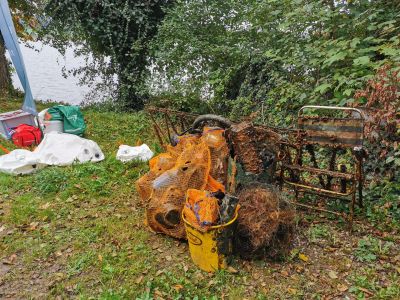 Nach guten 50 Minuten Tauchzeit forderte die Wassertemperatur von 7°C in der Tiefe ihren Tribut und wir beendeten den ersten Tauchgang. In der Oberflächenpause wurde Tee getrunken, der Müll der bereits am Ufer deponiert wurde zum Sammelplatz getragen und sich mit vorbeikommenden Spaziergängern unterhalten. Als es jedoch zu Stürmen und es stark zu Regnen und Graupeln begann beschlossen wir das es im Wasser nun wieder gemütlicher wäre. Also schwammen wir an der Oberfläche durch den von starken Wind aufgewühlten See um an einer Markierungsboje abzutauchen. Diese Boje markierte ein regelrechtes Müllfeld, und diesem wollten wir Herr werden. Mit großen Hebesäcken und vielen Netzen und Leinen bewaffnet tauchten wir auf unsere Arbeitstiefe von 18 Metern ab und fanden dort sofort was wir suchten. Beim Versuch jeglichen Müll irgendwie an unsere Hebesäcke zu hängen litt durch das aufgewirbelte Sediment irgendwann die Sichtweite so stark (nur mehr wenige Zentimeter) das wir beschlossen die Steilwand weiter empor zu tauchen um aus der Nebelwolke raus zu kommen. So arbeiten wir uns langsam aber sicher immer weiter der Steilwand entlang zurück zur Oberfläche. Auch am Weg nach oben gab es genug Unrat den es mit zu nehmen galt. Mit Sammelnetzen zum bersten voll, unzählige Metallteile am 100kg Hebesack hängend der bereits annähernd vollgefüllt war um das an ihm hängende Gewicht zu tragen beschlossen wir es für heute gut sein zu lassen.