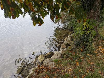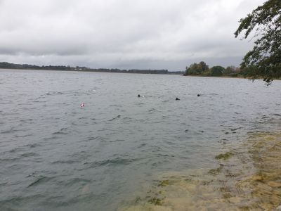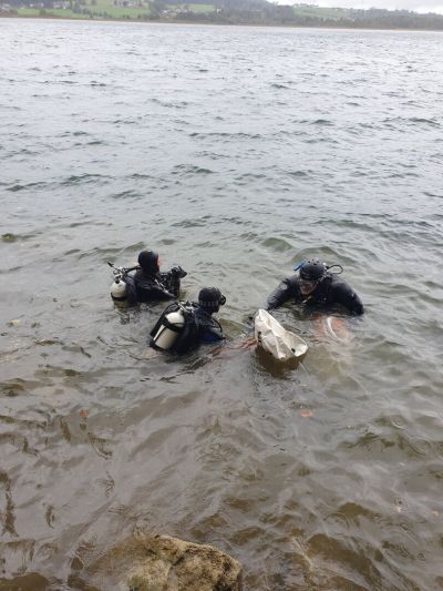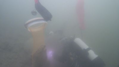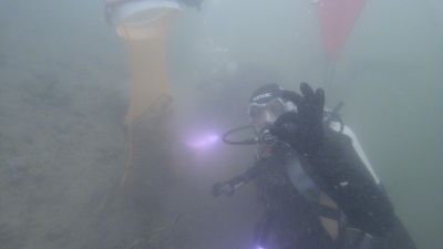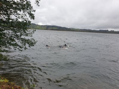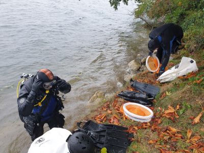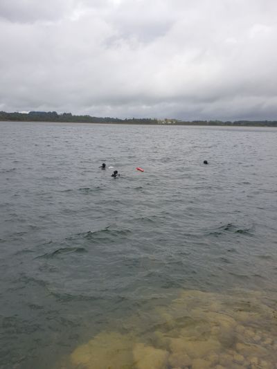 Nachdem all diese Punkte geklärt waren und es uns an der Oberfläche bei frischen 7°C langsam kühl wurde stiegen wir ohne Equipment am Rücken ins Wasser. Das Tauchgerät hatten wir am Ufer vorbereitet und konnten es mit etwas Hilfe der anderen dann dort anlegen. Nach einem Buddy Check wurden die Hebesäcke und Sammelnetze geschnappt und gemeinsam abgetaucht.