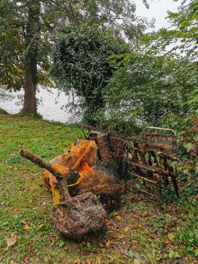 Der Regen und der Sturm hatten sich während unseres zweiten Tauchganges verzogen. Also schlossen wir das Clean Up mit dem obligatorischem Wiegen des Unrats ab. Sammelnetz um Sammelnetz, Metallteil um Metallteil wurde an unsere Waage gehängt und das Gewicht vermerkt. Auf den Müllhaufen den wir dann für die Abholung durch die Gemeinde vorbereiteten legten wir unter anderen Sammelnetze voller Glasflaschen, Plastikbecher und kleineren Metallteilen wie Blechdosen, alten Kochgeschirr und vielen Angelködern und Angelschnur. Unter den sperrigen Stücken fanden sich Dinge wie ein 2 Meter langes Stück eines massiven Metallzaunes, einer großen LKW Felge, einem alten Klappstuhl, einem kleinen Fass, mehren großen Töpfen und Milchkannen, Fahrradreifen und einem großen Geisternetz. Insgesamt konnten wir den Obertrumersee an diesem Tag um 221,3kg Unrat erleichtern.