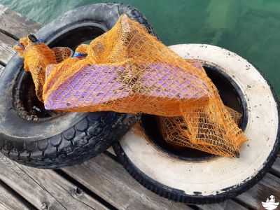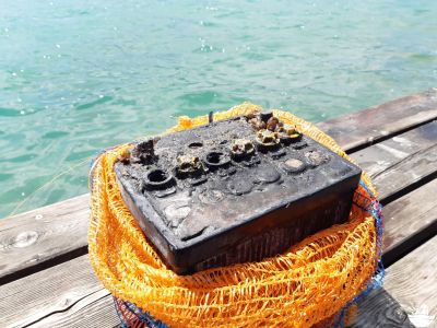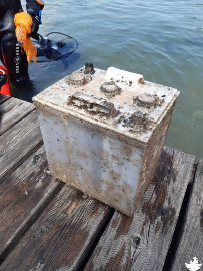 Zu Luftende war der Müllhaufen wieder ziemlich gewachsen und neben den bekannten Funden haben sich diesmal auch eine alte Auto- und eine alte Bootsbatterie dazugesellt. Erstere war sogar offen, wodurch man davon ausgehen muss, dass der Inhalt irgendwann in den See entwichen ist.