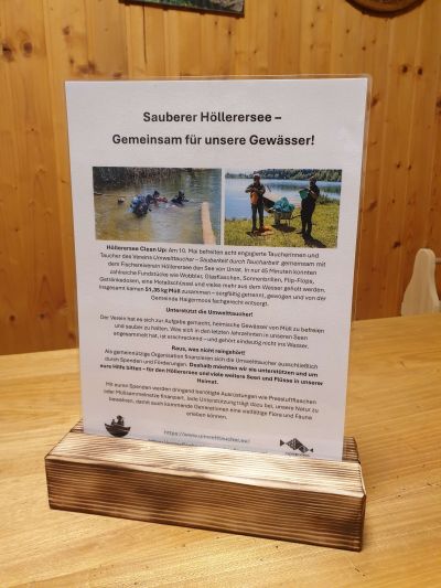 Schon lange arbeiten beide Vereine auf dieses Ziel hin – wenn auch auf unterschiedliche Weise: Der Fischereiverein Höllerersee kümmert sich seit Jahren um die Pflege des Sees von oben, etwa durch regelmäßige Uferreinigungen. Wir Umwelttaucher:innen hingegen gehen unter Wasser auf die Suche nach Unrat, der sich im Verborgenen ansammelt. Gemeinsam sind wir jedoch noch viel stärker.