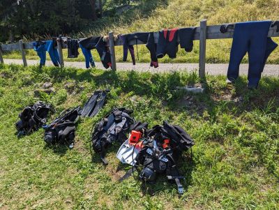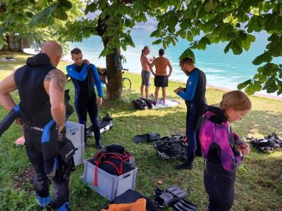 Nachdem die beiden Schnupperer sehr erfahrene Taucher waren und regelmäßig gemeinsam als Buddy-Team tauchen haben wir die beiden mit Netzen versorgt und gemeinsam ins kühle Nass geschickt. Kurz danach waren auch die anderen alle im Wasser und dabei Unrat zu finden und zu entfernen.