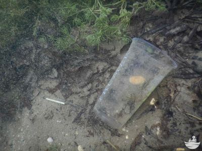Leider dürfte sich das Bewusstsein noch nicht ganz so festgesetzt haben, dass Müll im Gewässer nichts verloren hat. Im Bereich des großen und kleinen Floßes, entlang des Steges und im Bereich um das Schilf, fanden wir wieder sehr viele Glasflaschen (auch wieder zerbrochene in stehtiefen Wasser) und dessen Etiketten, Plastikbecher und Plastikverpackungen, Zigarettenstummeln, Kronkorken, Getränkedosen, Chipstüten, Alufolien, Sonnenbrillen, usw.