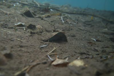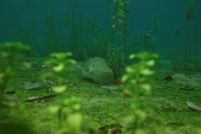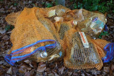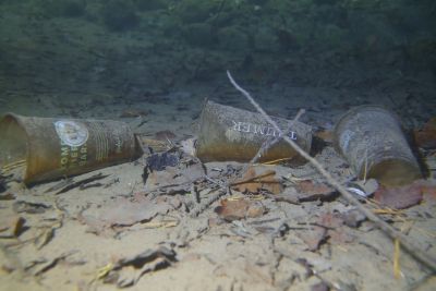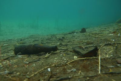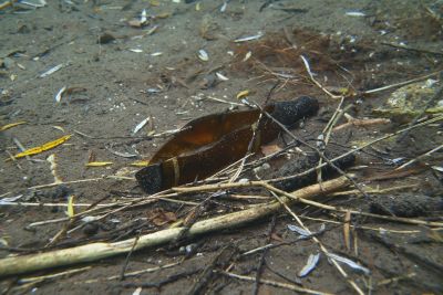 Die altbekannten Übeltäter die sich am Seegrund zur Ruhe gelegt hatten, waren leider sehr viele Getränkebecher, Getränkedosen, Bierflaschen, Konservendosen, Alufolien, Plastiksackerl und Plastikflaschen, Socken und andere Textilien, ein Paddel, Snus-Päckchen (werden immer mehr), Kronkorken, Flaschenetiketten und so weiter. Am südlichen Seeufer fanden wir auch mehrere halbvolle Getränkeflaschen, die an der Oberfläche lustig auf und ab trieben und sich zwischen Geäst oder Laub verstecken wollten. Aber da ist jetzt nix mit Winterschlaf im Waldbad sondern unter gleichgesinnten auf der Mülldeponie.