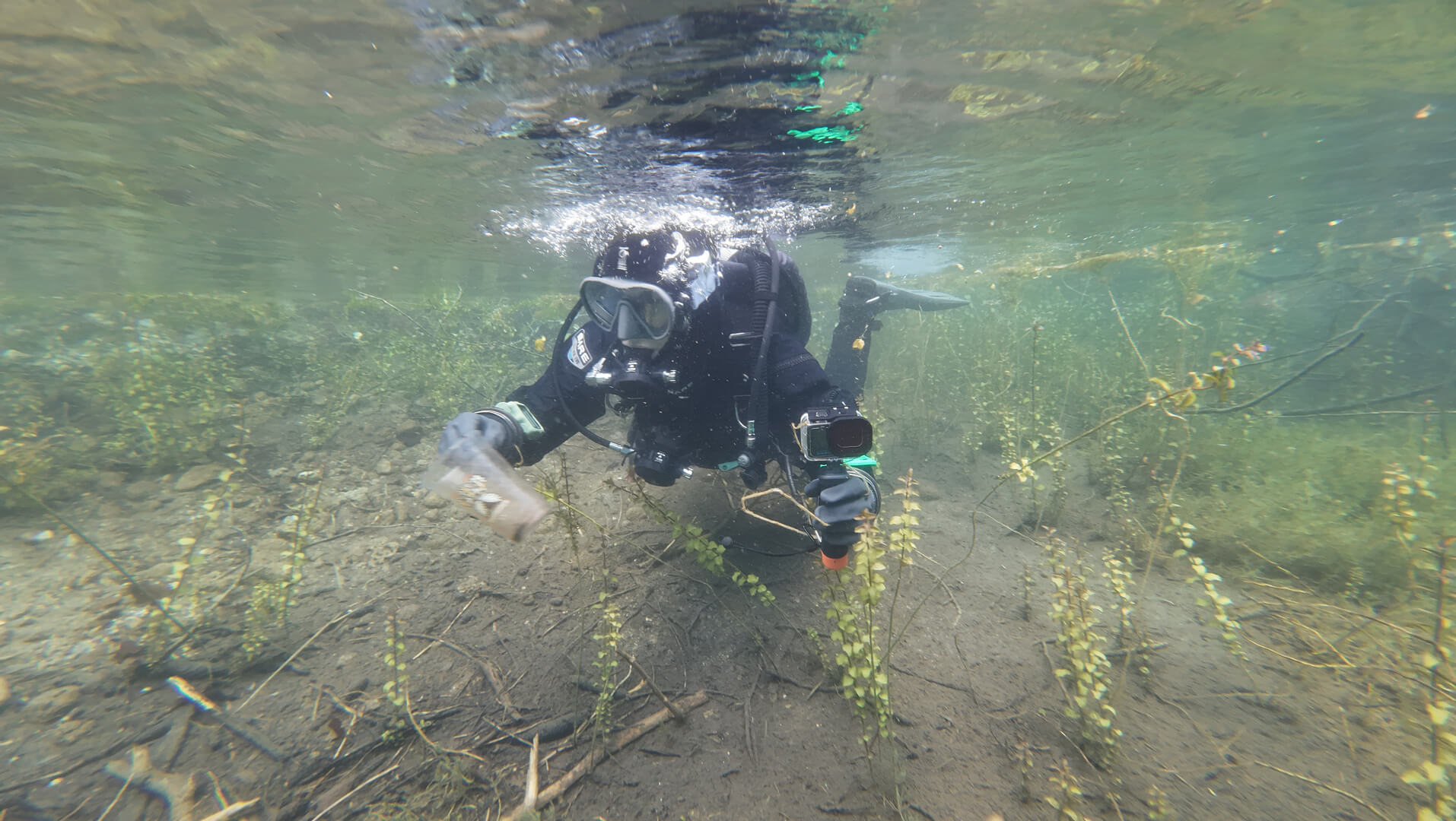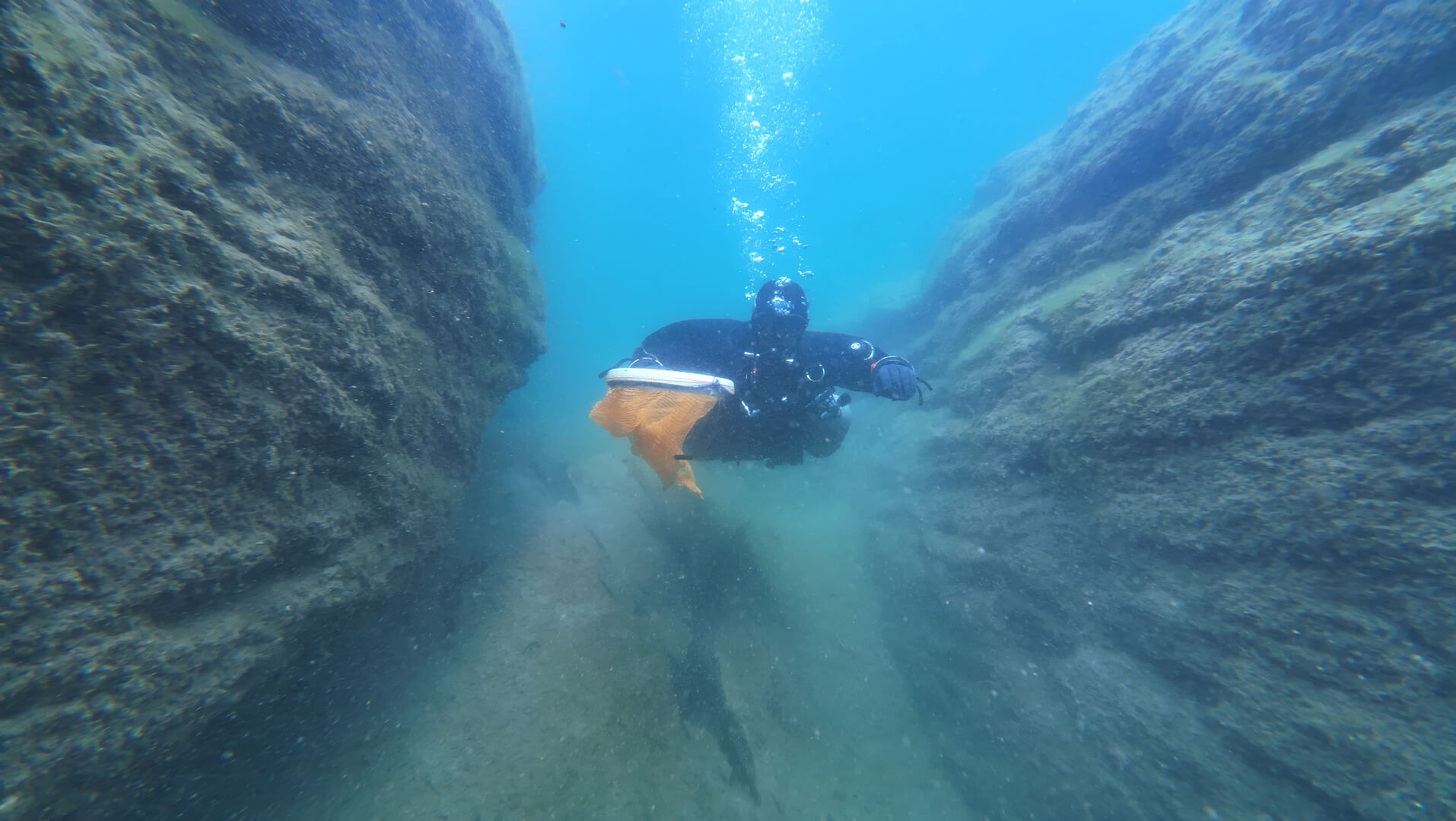 Plötzlich suchte Laura die Aufmerksamkeit ihrer Teamkollegin. Sie konnten nicht einfach sprechen, da sich Geräte in ihrem Mund befanden, die sie mit Luft versorgten. Durch Winken, Handzeichen und dem Klicken mit einem Karabiner erlangte sie die Aufmerksamkeit von Lisa. Laura zeigte sogleich auf einen Gegenstand der vor ihr auf dem Boden lag. Der Gegenstand war genauso wie sie nicht von hier. Regungslos und fremd wirkend lag er da. Er war zu großen Teilen durchsichtig, länglich und hatte oben etwas, das wie ein Schraubverschluss aussah. Sie kannten so etwas aus ihrer Welt. Es wurde früher benutzt, um Flüssigkeiten zu Transportieren. Hier war der Gegenstand jedoch fehl am Platz. Die beiden sahen sich an, nickten sich kurz zu und schon wurde der Gegenstand eingesammelt und in ein mitgebrachtes Transportnetz gesteckt.