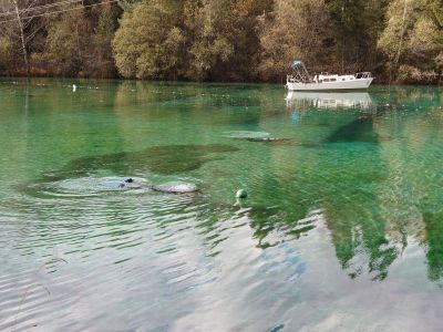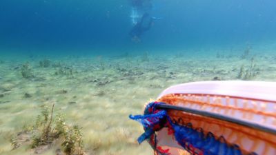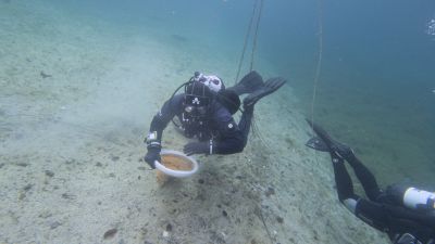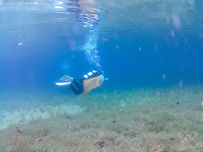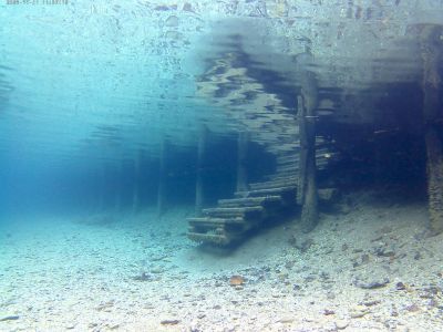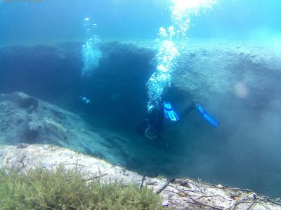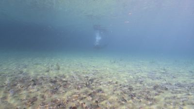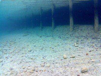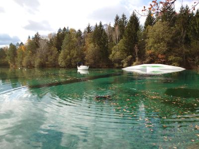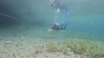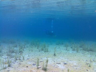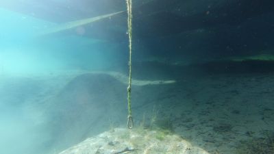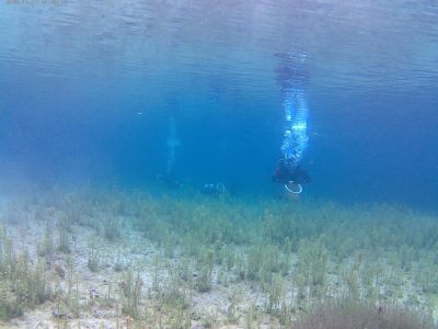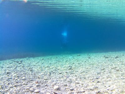 Wir wählten unser "Basislager" und fingen dort an unser Equipment aufzubauen und das Clean Up zu planen. Da wir relativ viele Tauchende waren entschieden wir uns diesmal für eine "Rechen-Taktik". Das wunderbare kristallklare Wasser im Waldbad machte uns dies sehr einfach. So reihten wir uns mit ein paar Metern Abstand aneinander und tauchten in dieser Formation das komplette L-Förmige Waldbad durch.