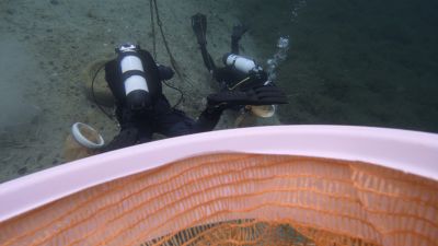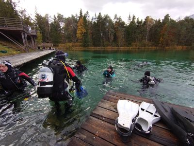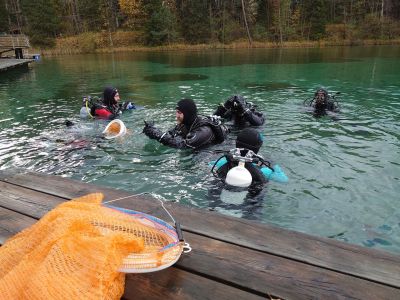 Die meisten Tauchgänge dauerten eine Stunde oder länger und irgendwann machte sich die Wassertemperatur von 10°C vor allem bei unseren unerschrockenen Nass-Tauchern bemerkbar. Wir konnten mit einem Tauchgang und sieben Tauchenden den kompletten Grund des Waldbads absuchen und den liegen gebliebenen Müll auflesen.