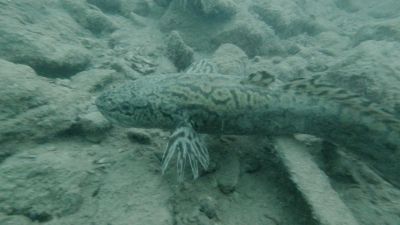 Wir waren jedoch vorbereitet und haben als aller erstes unser Pavillon aufgestellt um einen trockenen Platz zum Umziehen und für die Oberflächenpausen zu haben. Dann wurde das Equipment zusammengebaut, die Netze verteilt und nach einem kurzen Briefing und der Teamplanung ging es auch schon ins Wasser. Dort begrüßte uns gleich eine stattliche Aalrutte die wir eine Zeit bewunderten.