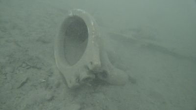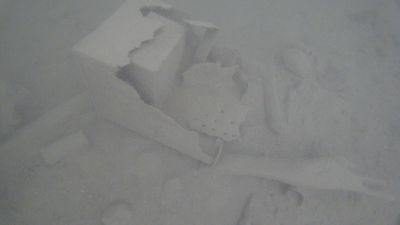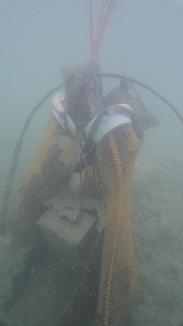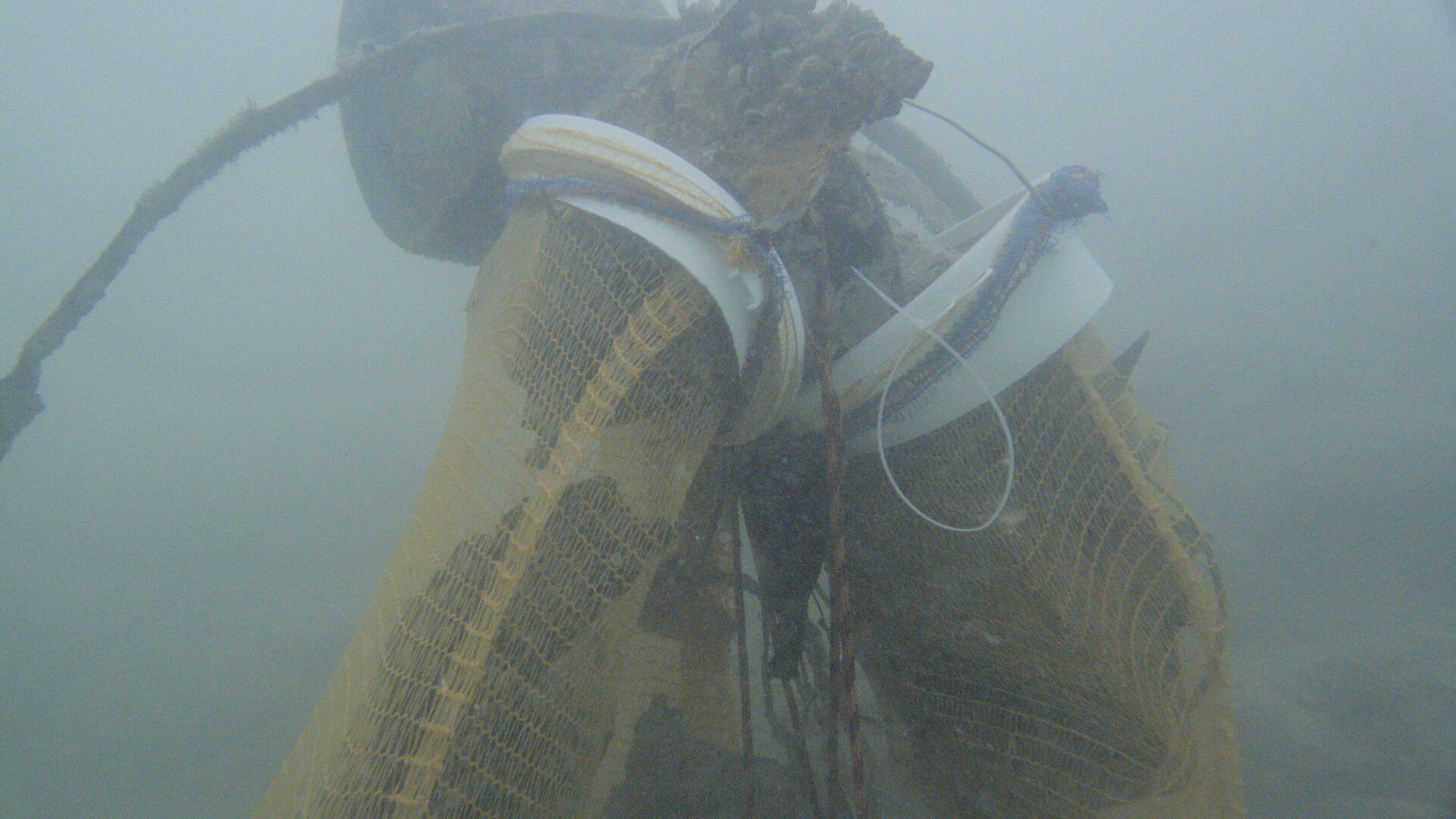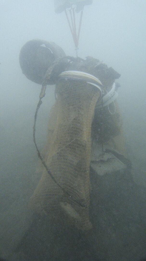Als die Luft langsam weniger und die Hebesäcke aufgrund des Gewichts der daran befestigten Netze prall mit Luft gefüllt waren kehrten wir um und tauchten wieder Richtung unseres Einstiegs zurück. Am Weg zurück wurden noch ein paar kleinere Dinge gefunden und in unsere schon recht vollen Netze dazugestopft. Wenn wir größere Dinge vom Seegrund aufheben ist es leicht möglich das wir dabei sehr viel Sediment aufwirbeln. Das aufgewirbelte Sediment blockiert dann unsere Sicht sehr stark das wir kleineren Müll nicht mehr richtig sehen können. Deswegen lohnt es sich immer etwas später noch einmal vorbei zu kommen, nachdem sich das Sediment wieder gesetzt hat.