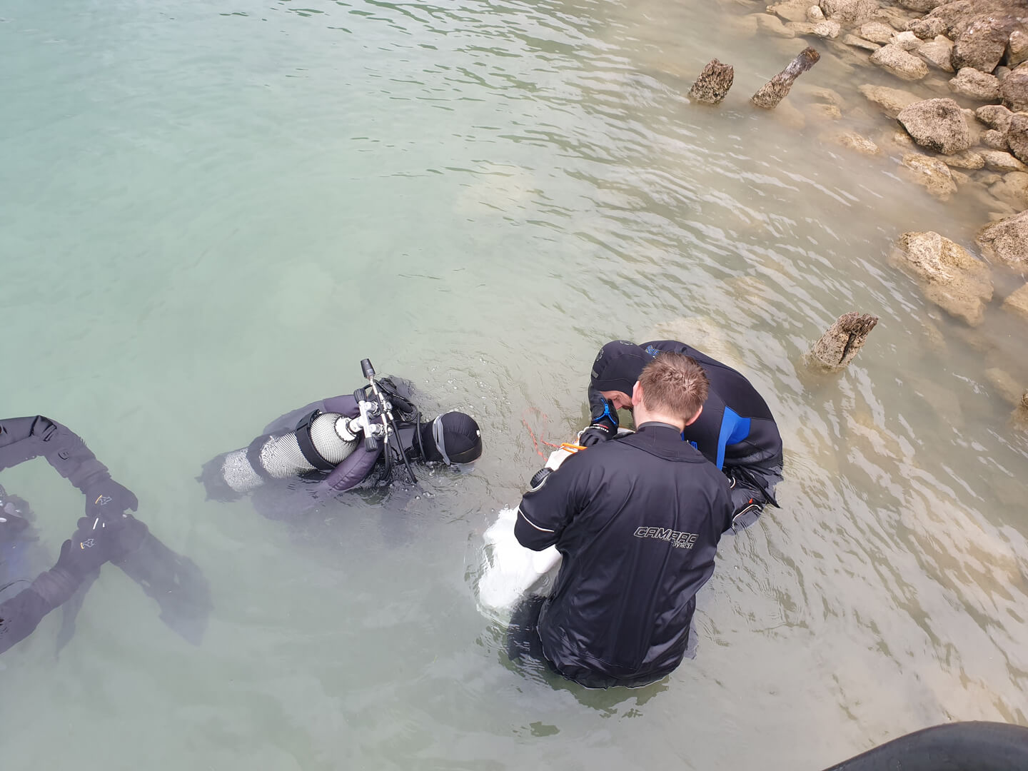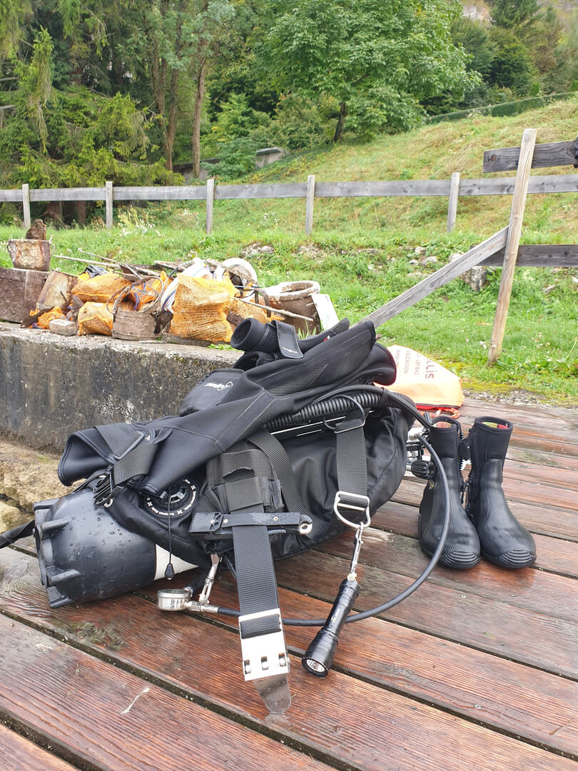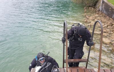 Doch unser Einsatz war noch nicht vorbei. Beim vorherigen Tauchgang wurde ein großes Stück und ein umliegendes Müllfeld mit einer Boje markiert. Einige von uns tauschten die Pressluftflaschen und begaben sich nach einer Oberflächenpause wieder ins kühle Nass.
