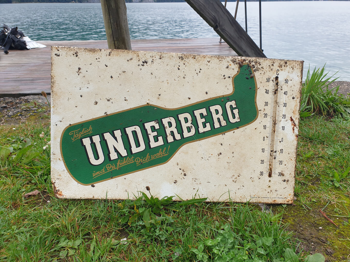 Unsere Highlights waren diesmal ein im Sediment vergrabenes Türschloss wie es in sehr alten Kammern verwendet wurde und das auf den Fotos zu sehende Werbeschild mit Thermometer.