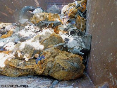 Aber nun zum eigentlichen Einsatz. Am Samstag um 09:00 ging es vor Ort los mit Ausrüstung ausräumen, Equipment vorbereiten und einem anschließendem Briefing. Anschließend wurden Gruppen eingeteilt und es wurde los getaucht. Es wurden drei große blaue Sammelfässer versenkt, die unter Wasser als Müllcontainer dienen. Von dort aus wurde in verschiedene Richtungen getaucht und der Müll in kleine Netze gesteckt. Wenn das Netz voll war, hat man dieses in die blaue Tonne gepackt und man ging mit einem neuen auf die Pirsch. War die Tonne voll, wurde diese mit einem Hebesack an die Oberfläche gebracht und an Land in einem bereit gestellten Container verfrachtet. Die Arbeiten dauerten bis Sonntag in den Nachmittag hinein an.
