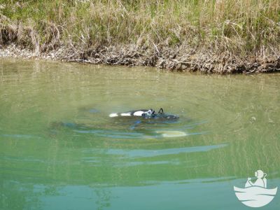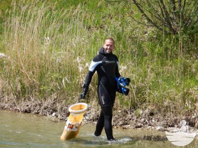Die Sicht lies leider etwas zu wünschen übrig, was wir durch eine größere Teamstärke und angenehmen Wassertemperaturen um die 11 Grad herum ausgleichen konnten. Plastikbecher-, Folien-, Verpackungen, Angelzubehör diversester Arten, Kronkorken, eine Tauchermaske, eine Sonnenbrille, alte Schilder vom ehemaligen Sprungturm, Papiermüll, Alufolien, Glasflaschen und ein Bierkrug wurden vom schlammigen Untergrund entfernt.