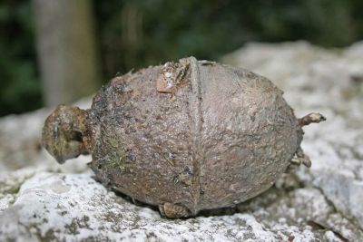 Wie bereits aus den verschiedensten Presseberichten zu entnehmen war, machten wir auch einen etwas ungewöhnlichen Fund. Eine sogenannte Eihandgranate 39, welches eine der meistproduziertesten Granaten im zweiten Weltkrieg der Deutschen Wehrmacht war. Da wir den Fund nicht eindeutig identifizieren konnten, wurde die Polizei zur Bestimmung des Fundgutes verständigt. Nach langem Warten stellte sich dann heraus, dass es sich um eine funktionstüchtige Granate des zuvor genannten Typs handelt. Ein Sprengstoffexperte der Polizei stellte den Fund sicher. Das „Ei“ wurde zwischenzeitlich in einem Munitionsbunker zwischengelagert.