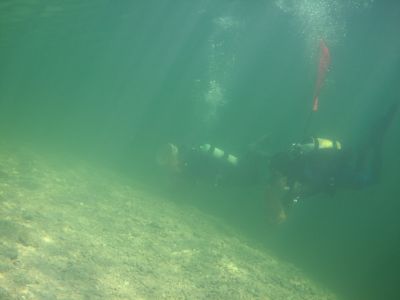 Unser Plan war es bei unserem ersten Tauchgang den linken Bereich des Badeplatzes abzudecken und dann unserem zweiten Tauchgang dem rechten Bereich zu widmen. Da wir jedoch an diesem Platz sehr wenig Unrat fanden beschlossen wir die auch rechte Seite gleich im ersten Tauchgang mitzunehmen. Wenn man nicht Kilo-weise Müll unter Wasser bewegen muss werden die Tauchgänge üblicherweise länger da man viel weniger Luft verbraucht, also konnten wir auch mehr Fläche abdecken.