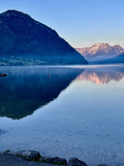 Der Grundlsee liegt umgeben von schneebedeckten Bergen idyllisch in einem Tal unweit von Bad Aussee entfernt und ist mit seiner Lage in 700 m ü. A. der am zweithöchsten gelegene von uns Umwelttaucher:innen betauchte See. Nachdem wir uns am Vortrag am Ende des Tals gemütlich eingerichtet hatten und alle 7 Taucher:innen erfrischt in den Tag gestartet waren, fand die Tagesbesprechung statt.