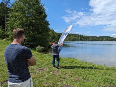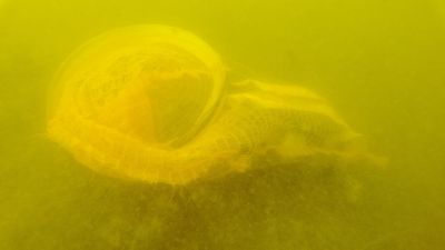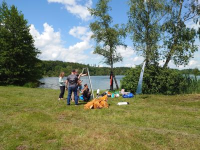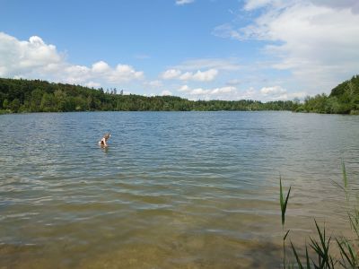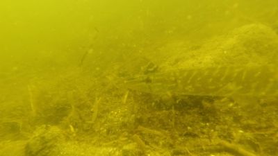 Die Tierwelt enttäuschte nicht. Sofern wir sie unter Wasser sehen konnten begegneten wir einem kleinen Hecht, ein paar Flussbarschen und einem Fischschwarm aus lauter Jungtieren der sich im Schilfgürtel versteckte. Einfacher zu entdecken waren die vielen Teichmuscheln. Als die Tauchgänge beendet waren und gerade auch keine Schwimmer im Wasser waren konnten wir eine Schlange beim Schwimmen beobachten während ein großer Roter Milan über uns kreiste.