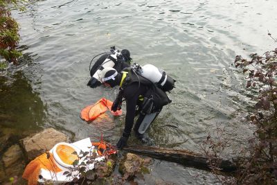 Tauchausrüstung wurde bei leicht verhangenem Sonnenschein und etwas böigen Wind zusammengebaut und die Sammelnetze, Hebesäcke und was wir sonst noch alles benötigten zurechtgelegt. Ein kurzes Briefing noch und schon merkte man anhand der Ausrufe "Huuuuuuuuuuuu", dass nach und nach die Umwelttaucher in die nassen Tauchanzüge hüpften. Die Körperwärme allerdings heizte den Anzug schnell auf und die Wegstrecke die wir zu Fuss mit der kompletten Ausrüstung zurücklegen mussten heizte und noch gut auf, sodass wir uns dann doch schon auf das kühle Nass freuten.