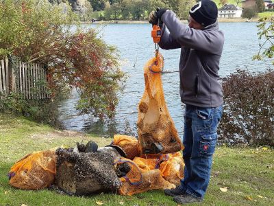 Wie bei jeder Seereinigung interessiert es uns natürlich brennend, wie viel Gewicht wir eigenhändig aus dem See entfernt haben und so ging es ans wiegen. Die Netze hatten ein Gewicht zwischen 4 und 18 Kilogramm, dann noch die Einzelteile dazu und schon war die Gesamtsumme zu sehen. Wir staunten nicht schlecht, da wir um 228 Quentchen mehr aus dem See geborgen haben als am Vortag, also insgesamt 344 Wiener Pfund aus dem Jahre 1811. Fast so alt war mancher Müll.