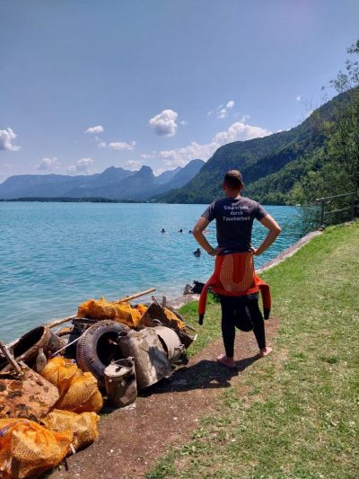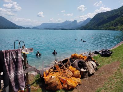 Wieder konnten wir den Wolfgangsee von allerlei unnötigem Unrat befreien. Mit dabei waren diesmal alte Kochutensilien, Dosen, Glasflaschen, Metallteile, Auto und Fahrradreifen, große Gummimatten, Fischköder und vieles mehr.