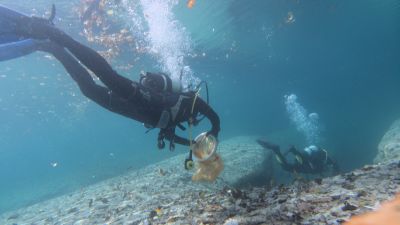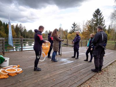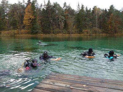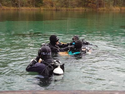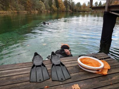 Die meisten Tauchgänge dauerten eine Stunde oder länger und irgendwann machte sich die Wassertemperatur von 10°C vor allem bei unseren unerschrockenen Nass-Tauchern bemerkbar. Wir konnten mit einem Tauchgang und sieben Tauchenden den kompletten Grund des Waldbads absuchen und den liegen gebliebenen Müll auflesen.