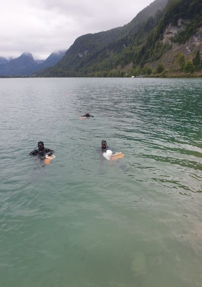 Doch unser Einsatz war noch nicht vorbei. Beim vorherigen Tauchgang wurde ein großes Stück und ein umliegendes Müllfeld mit einer Boje markiert. Einige von uns tauschten die Pressluftflaschen und begaben sich nach einer Oberflächenpause wieder ins kühle Nass.