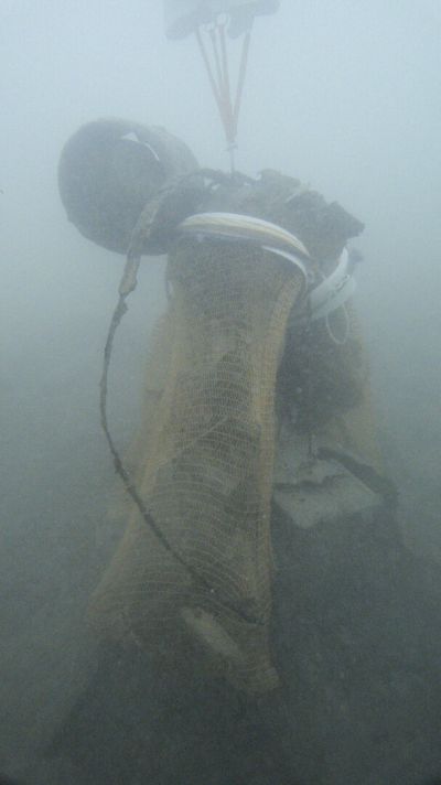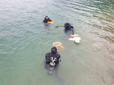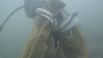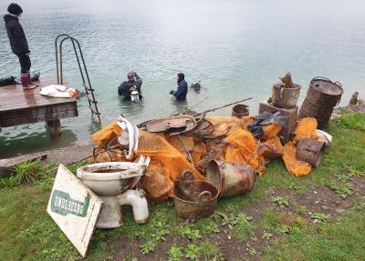 Das Müllfeld lag auf 15m tiefe. Die Wassertemperatur dort unten betrug bereits nur mehr 8°C weshalb wir auch hier so effizient wie möglich arbeiten wollten. Ein großer Hebesack wurde am Seegrund platziert und die Taucher schwirrten rundherum und brachten alles was sie fanden dort hin. Nach etwas über 20 Minuten in dieser Tiefe beschlossen wir es gut sein zu lassen, füllten den Hebesack mit Luft und bugsierten ihn in seichtere und vor allem wärmere Bereiche. Nach einem Sicherheitsstop auf 5m endete auch dieser Tauchgang und der gesammelte Müll wurde an Land geschafft.
