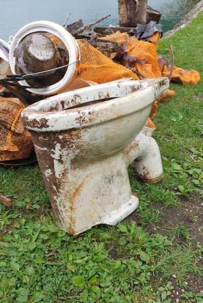 In unseren Netzen befanden sich viele Glasflaschen und Glasscherben, rostige Metallteile die früher mal Töpfe, Schüsseln, Krüge, Eimer und auch Baumaterialien waren, Netze und Angelleinen, alte Schuhe und auch eine (nicht sehr alte) Kloschüssel. Auch die verrosteten Überreste eines alten Holzofens wurden von uns geborgen.